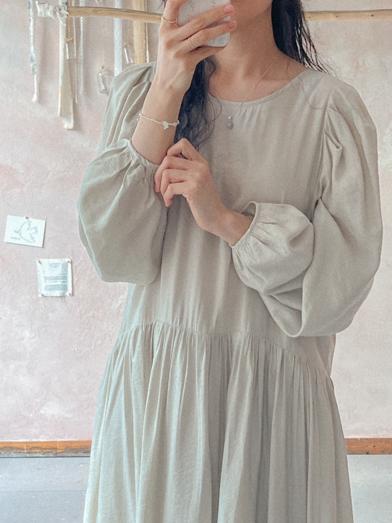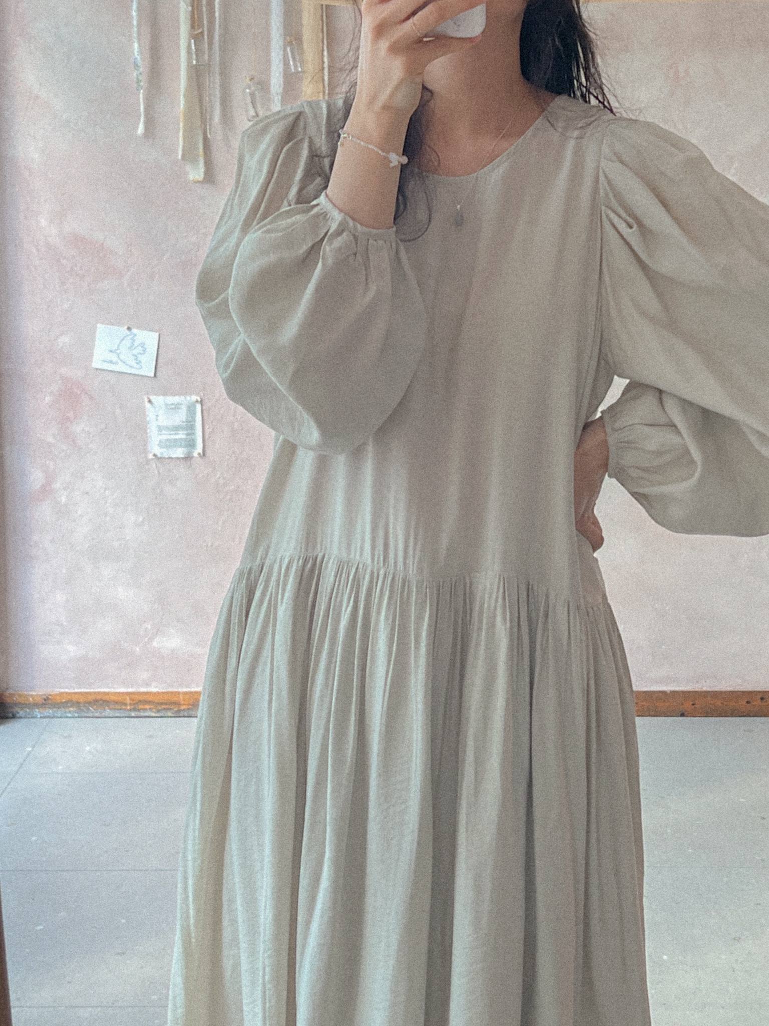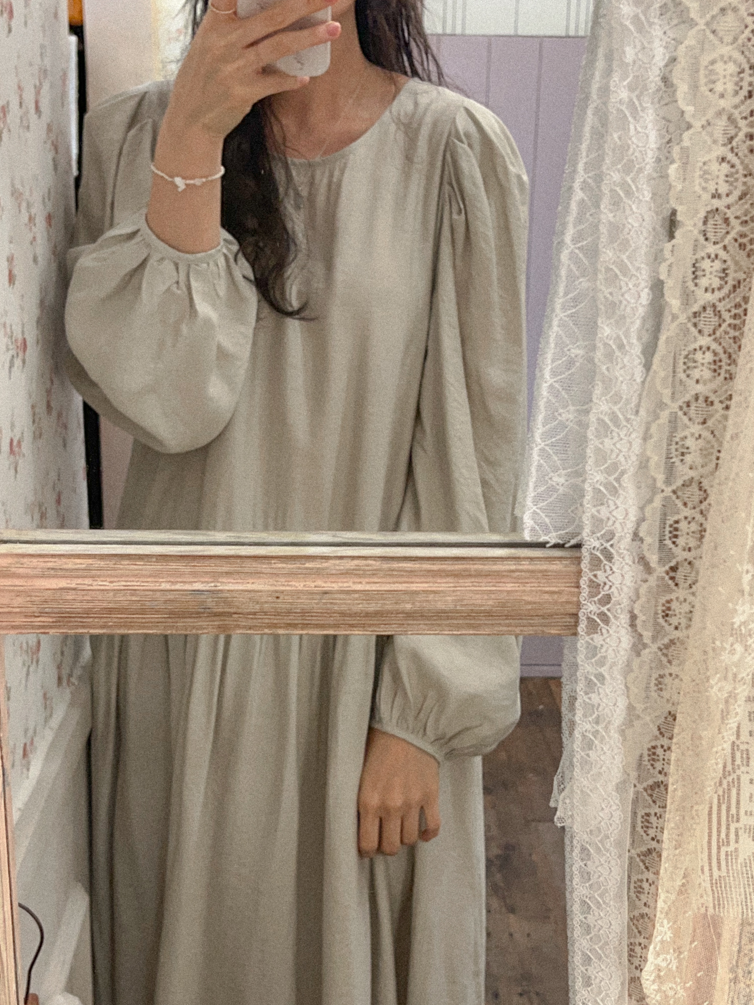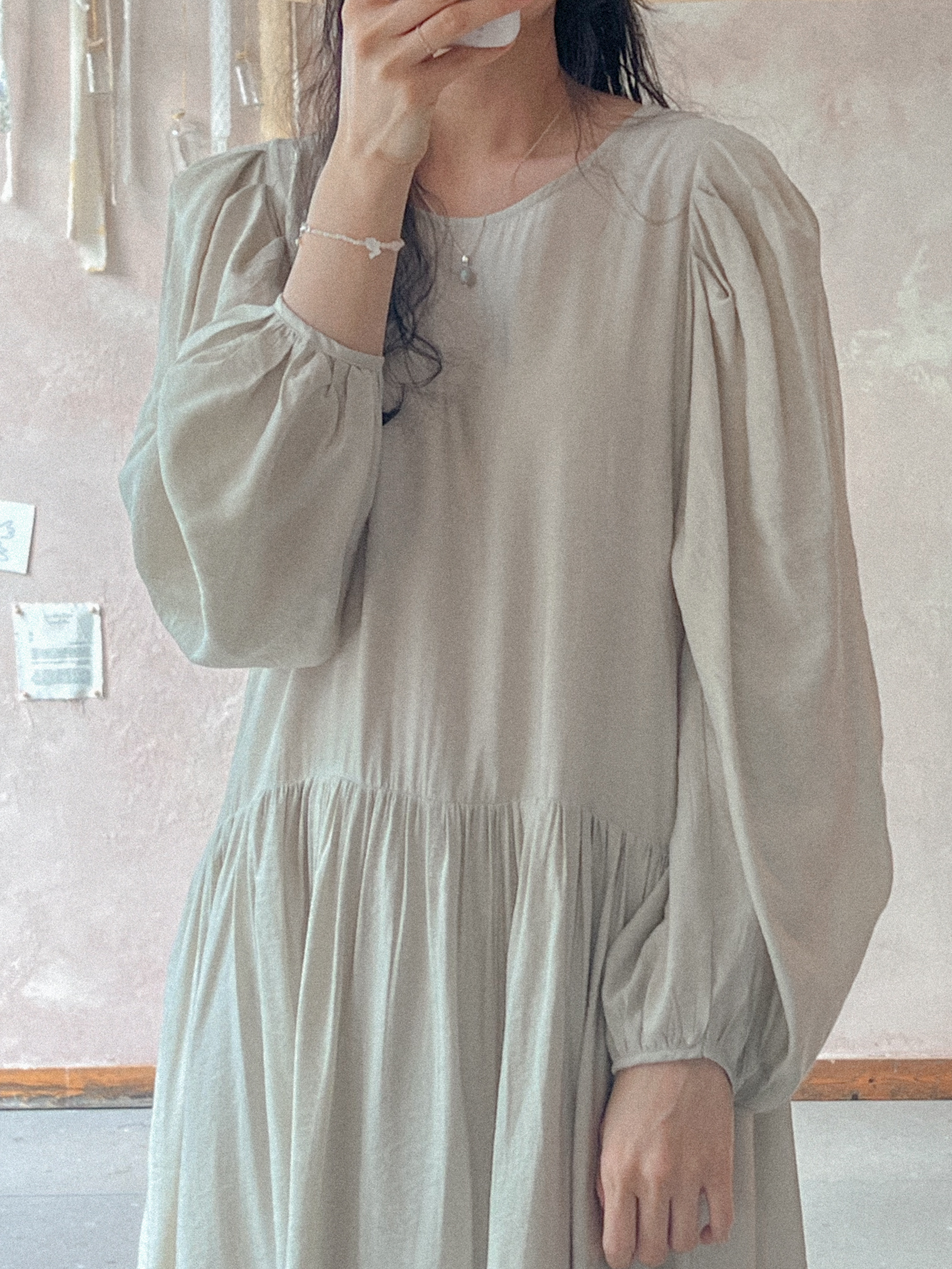 적당히 쇄골라인까지 파여있는 라운드넥에 어깨를 감싸주는 퍼프 소매가