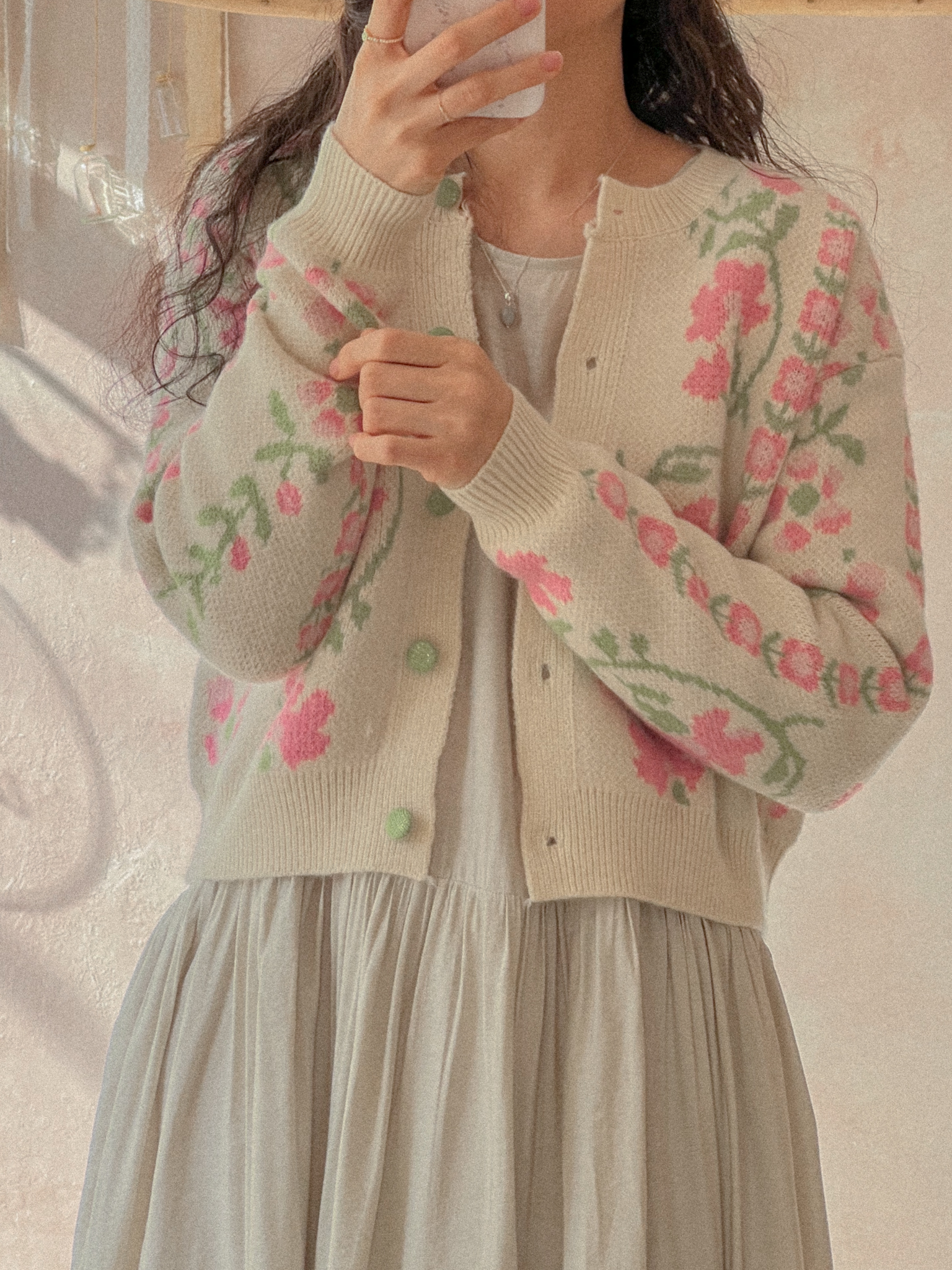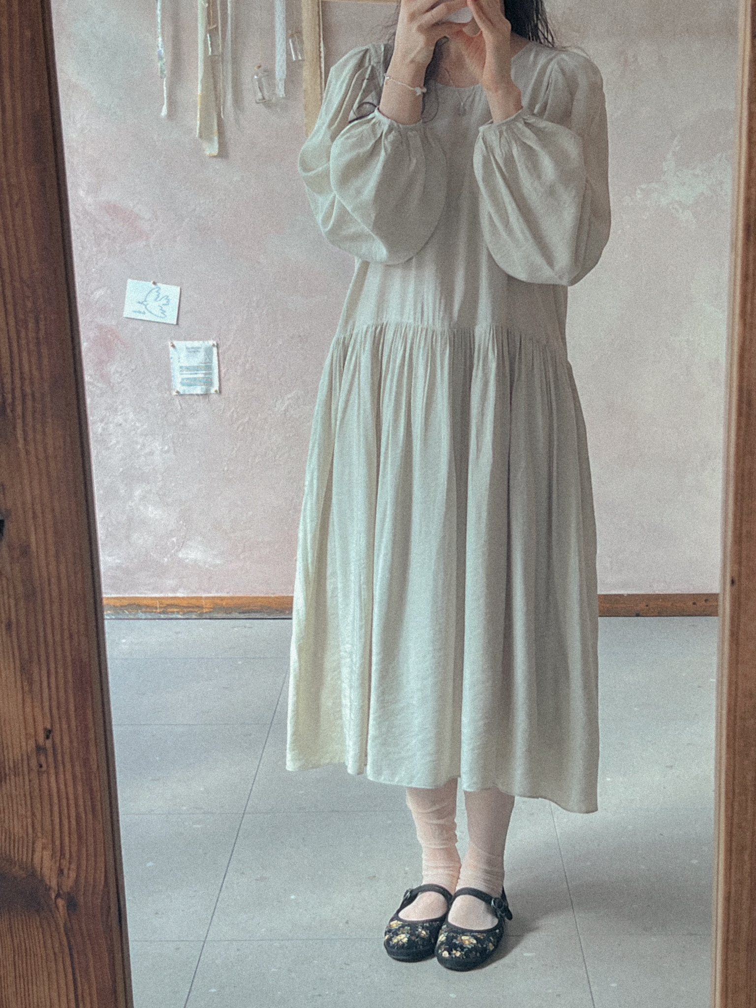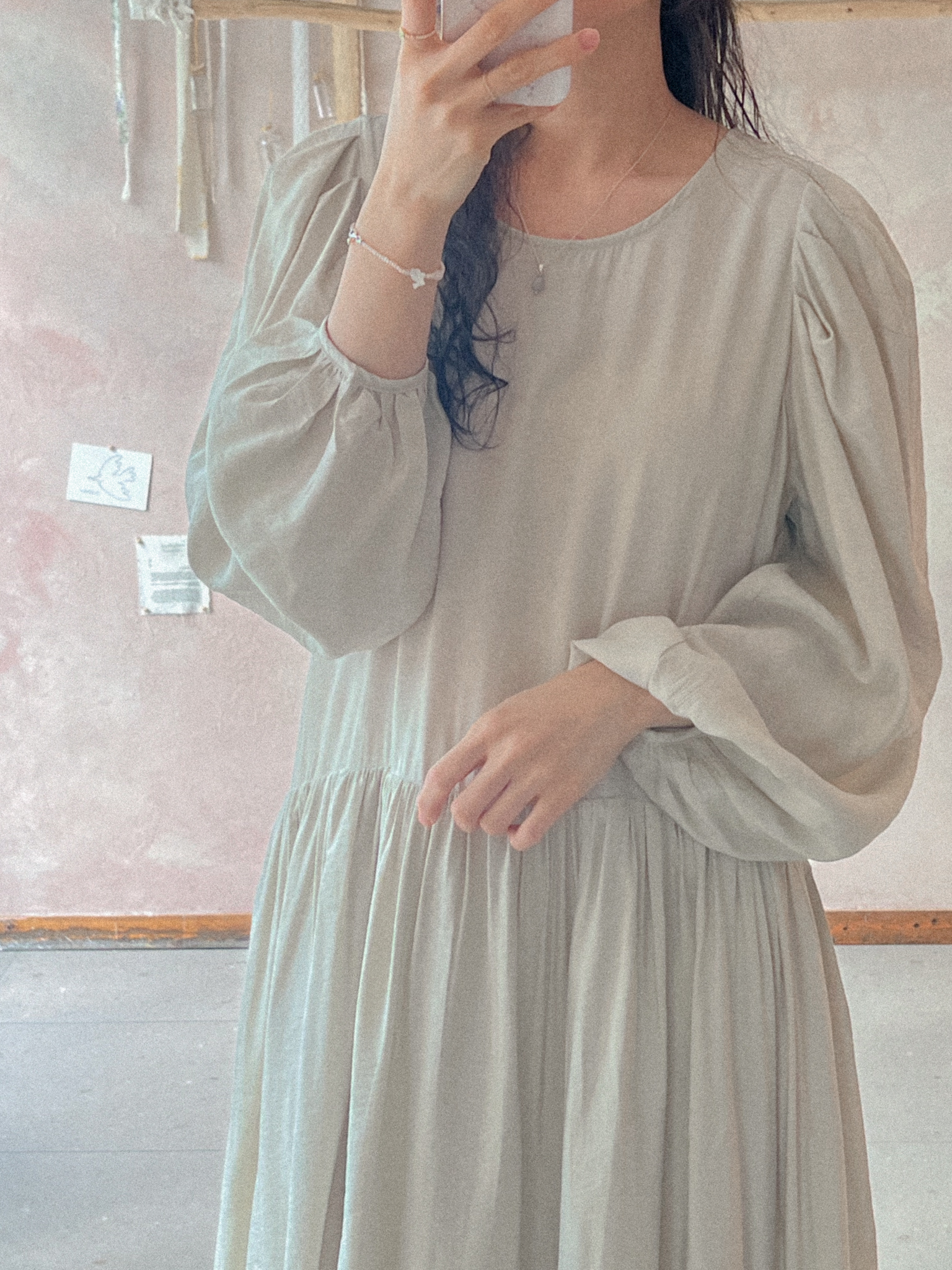 적당히 쇄골라인까지 파여있는 라운드넥에 어깨를 감싸주는 퍼프 소매가